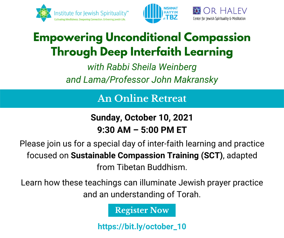October 10, 2021 @ 9:30 am – 5:00 pm – with Rabbi Sheila Weinberg and Lama/Professor John Makransky Please join the Institute for Jewish Spirituality, Or HaLev and Nishmat Hayim: TBZ’s Breath of Life Project for a special day of inter-faith learning and practice with master teachers Rabbi Sheila Weinberg and Lama/Professor John Makransky. John will share his teachings in Sustainable Compassion Training (SCT), adapted […]