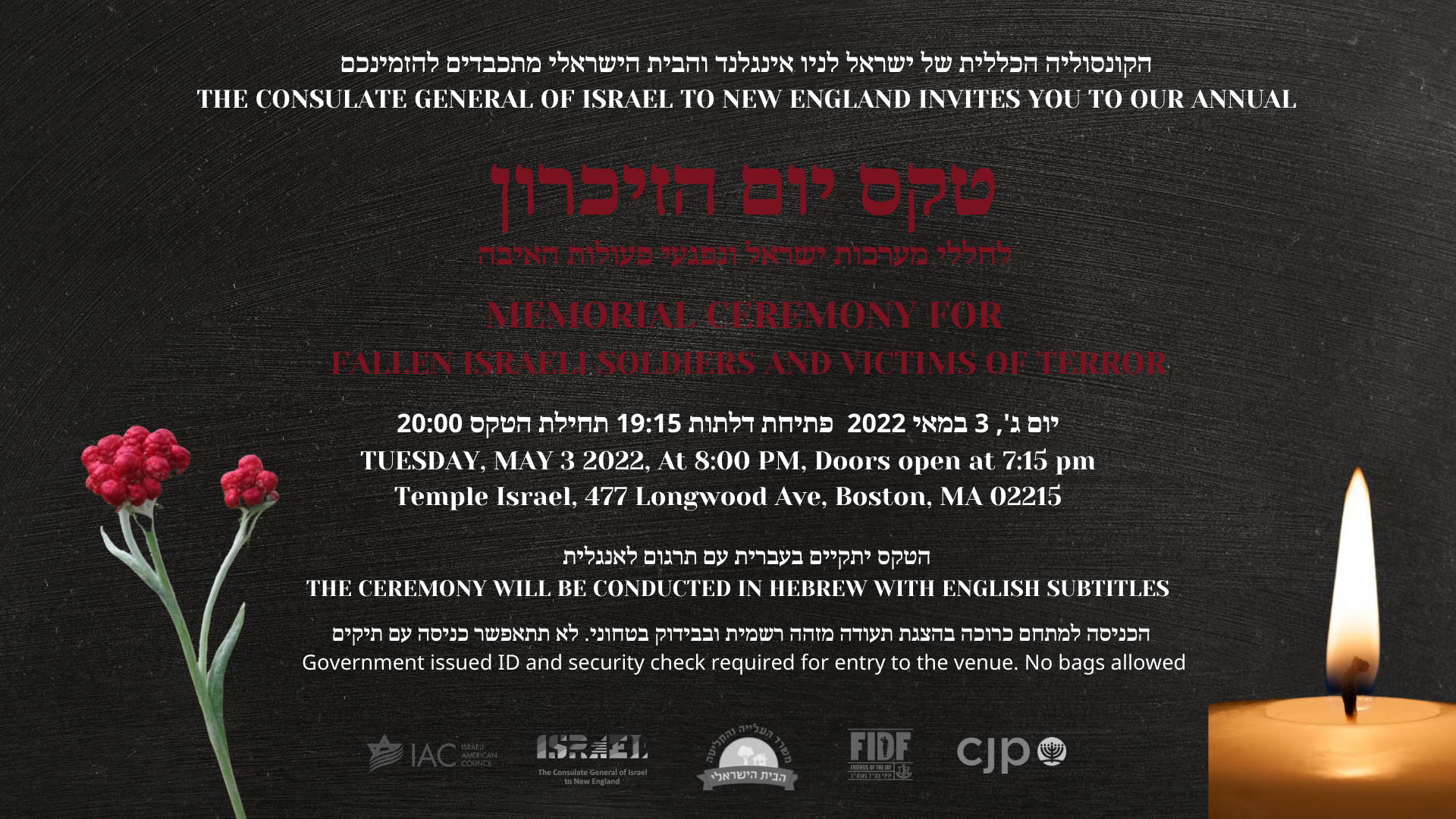 May 3, 2022 @ 8:00 pm – 9:00 pm – The Consulate Genral of Israel to New England Invites you to Our Annual Yom HaZikaron Event: A Memorial Ceremony for Fallen Israeli Soldiers and Victims of Terror Tuesday, May 3 at 8:00pm The event will be in Hebrew with English subtitles at Temple Israel, 477 Longwood Ave, Boston, MA 02215 More Info HERE.